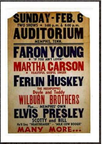 Jean Earle writes from England, “I was pleased to receive the latest newsletter. One item really caught my eye. The sale of the Poster…for such a huge sum of dollars. It is hard to believe…..I decided to look through one of my Elvis Presley books as I remembered seeing a poster for another show, in another auditorium in the same year. Memphis in February 1955….Two shows 3.00pm & 8.00pm. Maybe the posters are not as RARE as the new buyer may think. The book is On the Road To Stardom by Jim Black….1988. I remember being rather pleased to see that Faron and Ferlin were both higher up the programme than the young Elvis. Keep up the good work.”