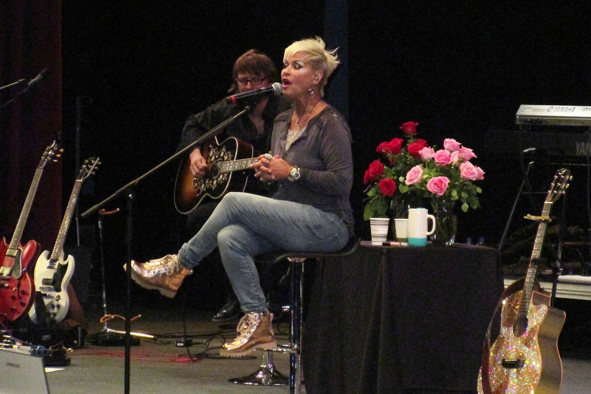 Lorrie’s five-piece band included lead and acoustic guitars, keyboard, drums, and electric bass. After closing the show with “Something In Red,” the group came back for an encore. The band gathered around Lorrie, and with the band leader on a lone guitar, they sang Elvis Presley’s version of “Are You Lonesome Tonight.” Lorrie did the recitation while the others harmonized. She said they worked up the song in Wisconsin and were trying it for the first time. As with the whole show, it was a great success.