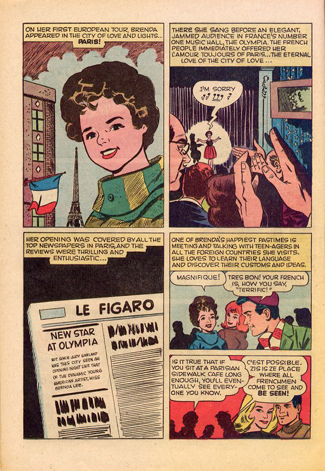 Dominique “Imperial” Anglares writes from France, “Thank you very much for that newsletter closing another year. Nice to read about Leon Rhodes but also Harlan Howard, Brenda Lee and Cindy Walker. Brenda Lee came in Paris, France, on February 17, 1959, and was welcomed by Gilbert Bécaud, a famous singer/songwriter (What Now My Love? / Let It Be Me). She came to play the famous Olympia, staying several weeks. Here’s a nice little cartoon from 1962 dealing with that first trip in Europe.”