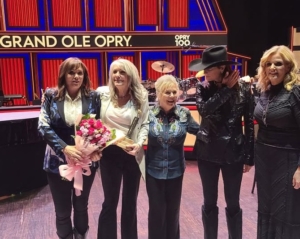When Kathy Mattea was inducted into the Grand Ole Opry this past Saturday evening, she sang “Eighteen Wheels and A Dozen Roses,” with Terri Clark, Trisha Yearwood, and Suzy Bogguss as her harmony singers. She interrupted the song to say that, as the newest member of the Opry, she had already been given her first job. Then she announced, “On behalf of my friends, Trisha and Terri, and the entire Grand Ole Opry family, Suzy Bogguss, . . . would you like to be the next member of the Grand Ole Opry?” Suzy said yes. After a few minutes of congratulations, they finished the song.