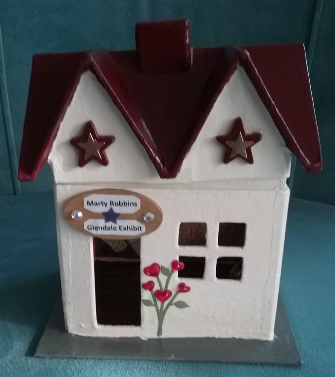 Jo Wenger writes from Oregon, “Out of touch for a while. Please add my new email to your Marty Robbins news list. I made a darling craft house that looks like the old Marty Robbins Glendale Exhibit house that Juanita had on Myrtle. I wish the city would buy the house and bring her back from Willcox to run it. It was the perfect house, in the perfect place for a perfect Legend. Someone lives there now. No Marty reference at all. We had learned that Marty actually stayed there as a friend of his lived there and he would spend the night. If we had had a good mayor then in Glendale this Willcox mess never would have happened. I am in Oregon now but remember how hard everyone worked to get the house opened for Marty. Many people worked tirelessly to help get it opened in 2003. I hope the city will buy it and bring the Marty Exhibit back where it belongs. This house was made by me according to my recollection of the Marty Robbins house in Glendale. I give credit to God for this house as I did not know what I was going to make, then I was directed. Being a fan, I had lots of decals, stickers and photos. Hope you like it and that it will inspire others to make crafts for Marty.”