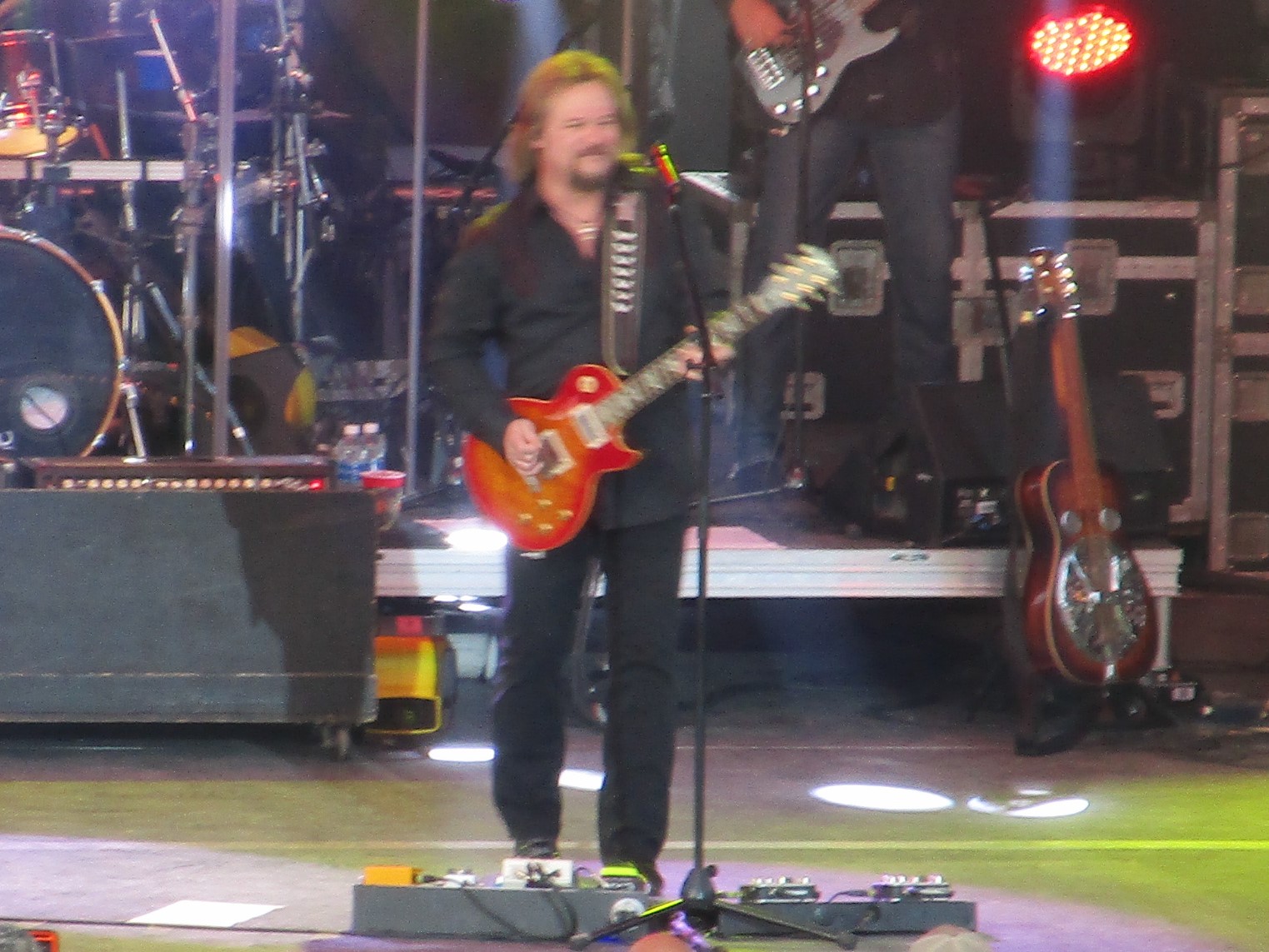The music volume was about right for an outdoor concert, but it overran his vocals. The words were often difficult to hear. Because of flashing lights & shadow & distance, I couldn’t tell how many musicians were on the stage. Travis introduced the Country Club band toward the end of the concert–fiddle (also guitar and mandolin), steel guitar (and dobro), bass (and harmony), drums, keyboard, lead guitar (a hometown friend who has been with him since his beginning).